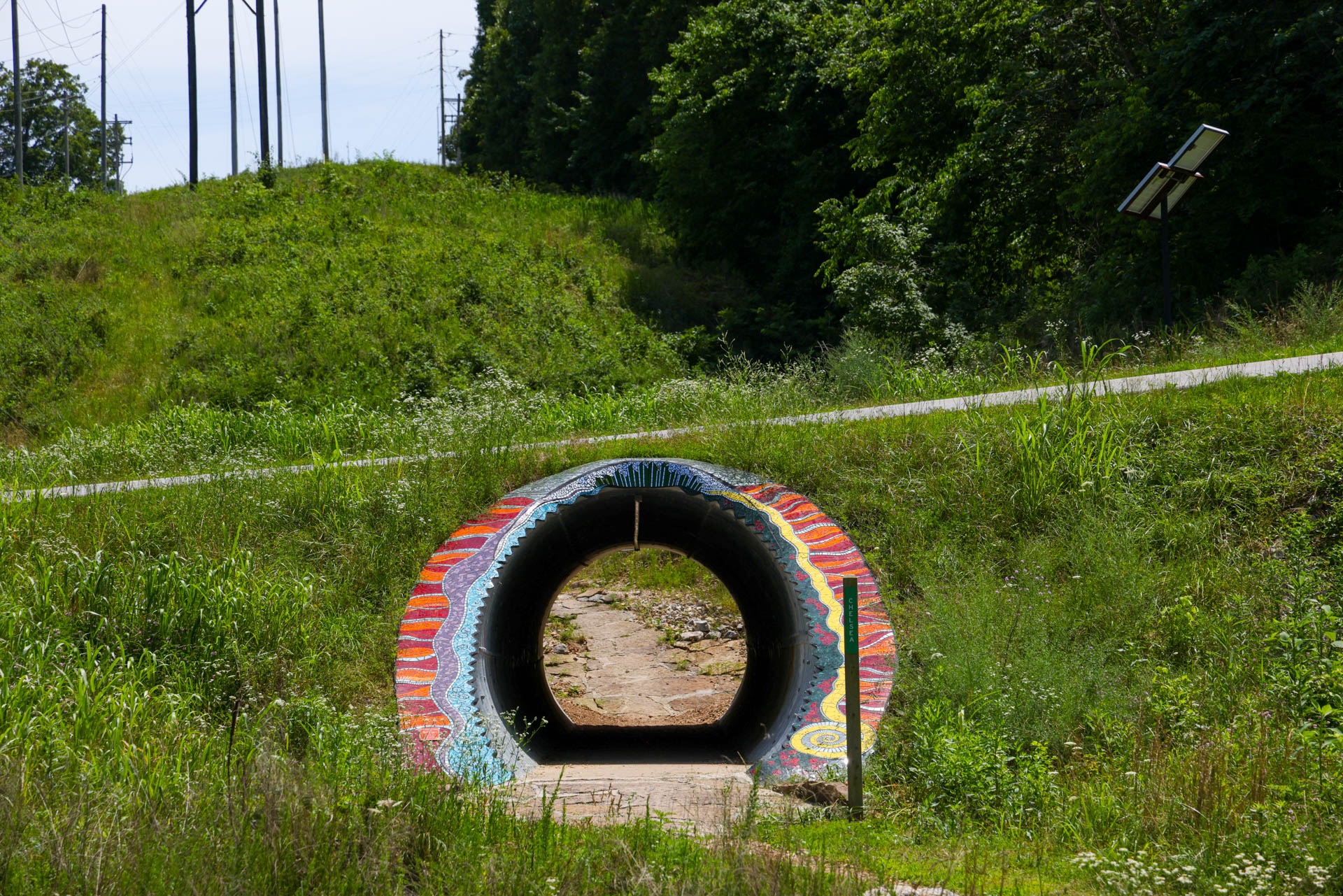 “Oz” as in Ozarks, has become a common theme throughout Northwest Arkansas. The mural is the journey in search of OZ, the emerald city, finding the beauty of what is already here. The yellow and green sections leading toward the top of the tunnel signify the yellow brick road and the poppy field in the movie ‘The Wizard of Oz’. The flat small area at the top of the tunnel has green towers with vertical mirror signifying the destination.